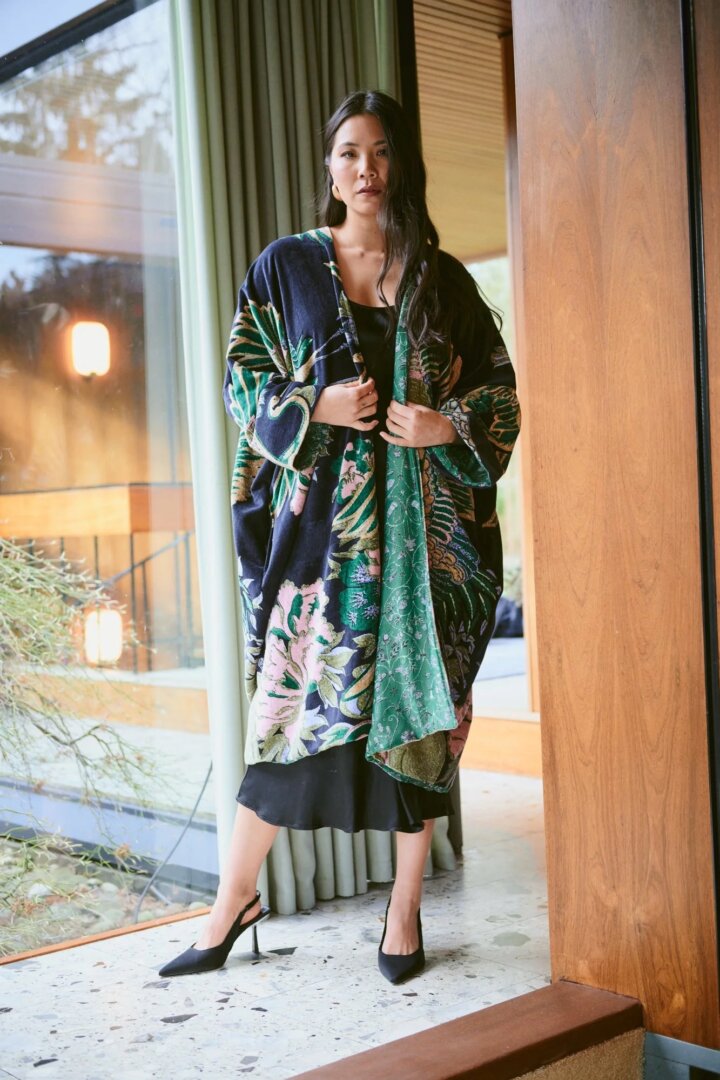 Aivan taivaallinen puuvillasamettinen vintagetyyliä henkivä Grande Kimono Crane Emerald Velvet samettitakki. Upea samettitakki on reilua kokoa ja menee monelle. Tähän on ihana kietoutua arjessa ja juhlassa! Takissa on taskut sivusaumoissa ja kontrastivuori.