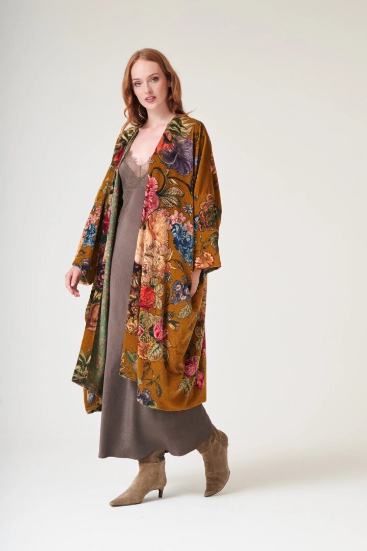 Aivan taivaallinen puuvillasamettinen vintagetyyliä henkivä Grande Kimono Primula Gold Velvet samettitakki. Upea samettitakki on reilua kokoa ja menee monelle. Tähän on ihana kietoutua arjessa ja juhlassa! Takissa on taskut sivusaumoissa ja kontrastivuori.