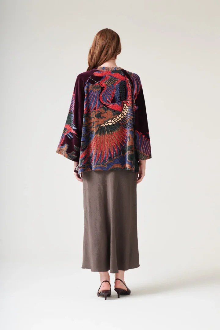 Taivaallisen pehmeä, kuvankaunis Crane Plum Velvet -samettijakku. Jakussa on mandariinikaulus, edessä taskut, helmiäsnapit ja 3/4-pituiset hihat. Jakku on laskeutuvaa puuvillasamettia, ja siinä on vuori. Arkeen, juhlaan, kesään, talveen – jakku on todella monikäyttöinen.